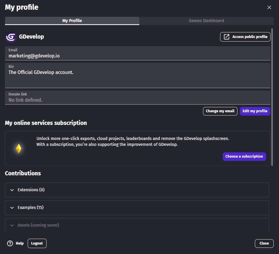 The profile page allows you to manage your GDevelop account, and customize what others see on your profile. This is also the place to manage your subscription. A GDevelop account is needed to use GDevelop services such as the one-click export of your game for Android, iOS, Windows, macOS, Linux, and gd.games.